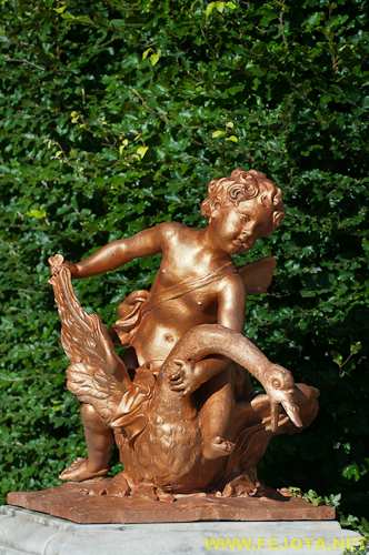 Castilla_y_León La_Granja_de_San_Ildefonso Parque Segovia cisne detalle escultura fuente_de_las_ocho_calles geniecillo jardines mitología vertical