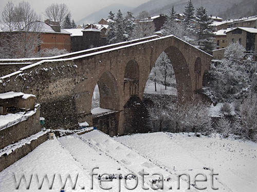 Catalunya Girona Sant_Joan_de_les_Abadesses paisaje nieve pintoresco puente_viejo gótico siglo_XV río_Ter