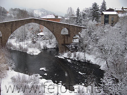 Catalunya Girona Sant_Joan_de_les_Abadesses paisaje nieve pintoresco puente_viejo gótico siglo_XV río_Ter