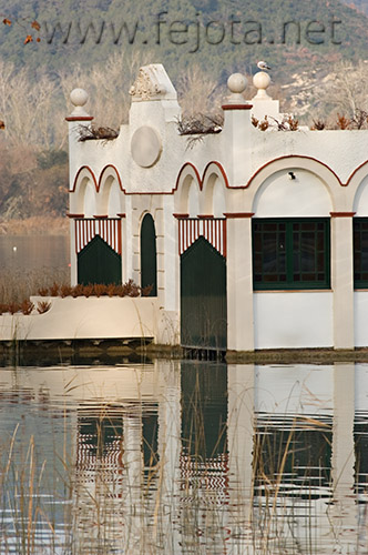 Pesquera paisaje rural lago edificio Banyoles Girona Catalunya vertical reflejo