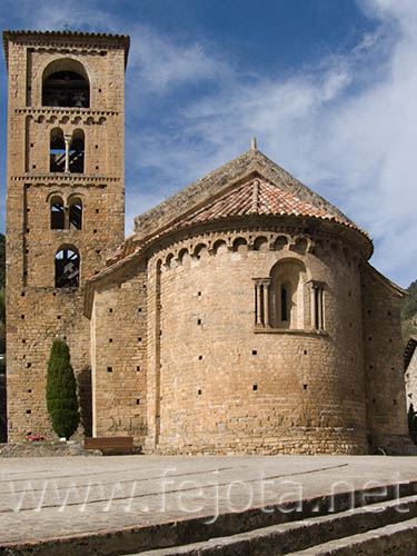 Iglesia torre campanario bside Beget Girona Catalunya vertical