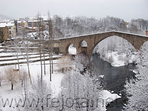 Catalunya Girona Sant_Joan_de_les_Abadesses paisaje nieve pintoresco puente_viejo gótico siglo_XV río_Ter