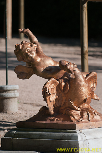 Castilla_y_León La_Granja_de_San_Ildefonso Parque Segovia cisne detalle escultura fuente_de_las_ocho_calles geniecillo jardines mitología vertical