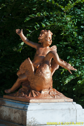 Castilla_y_León La_Granja_de_San_Ildefonso Parque Segovia cisne detalle escultura fuente_de_las_ocho_calles geniecillo jardines mitología vertical